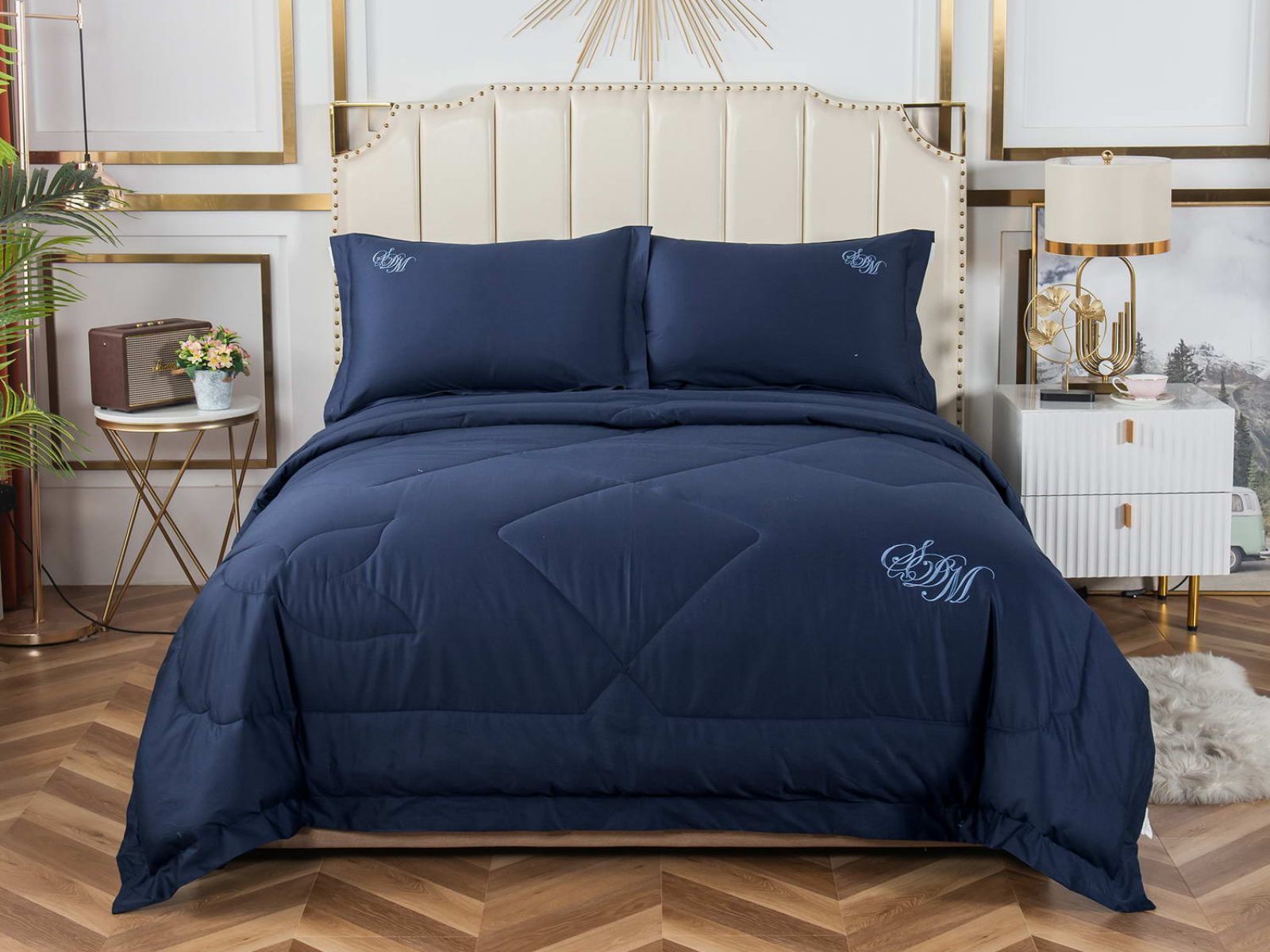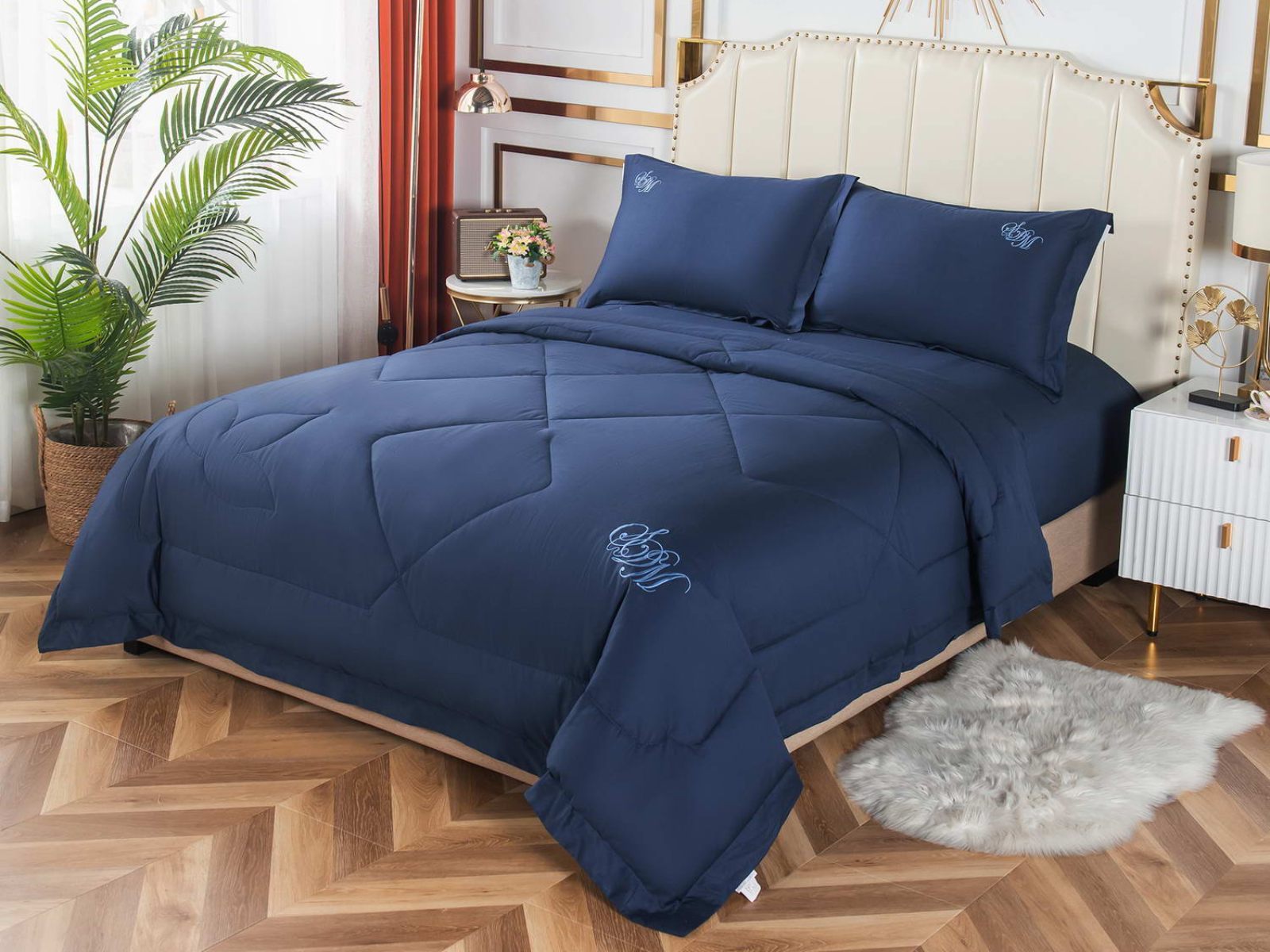 В комплект входят простыня, наволочки и одеяло. Одеяло простеганное, легкое и воздушное, его можно стирать в стиральной машине. Благодаря микроволокну в составе наполнителя для одеяла, оно всегда принимает свою начальную форму.