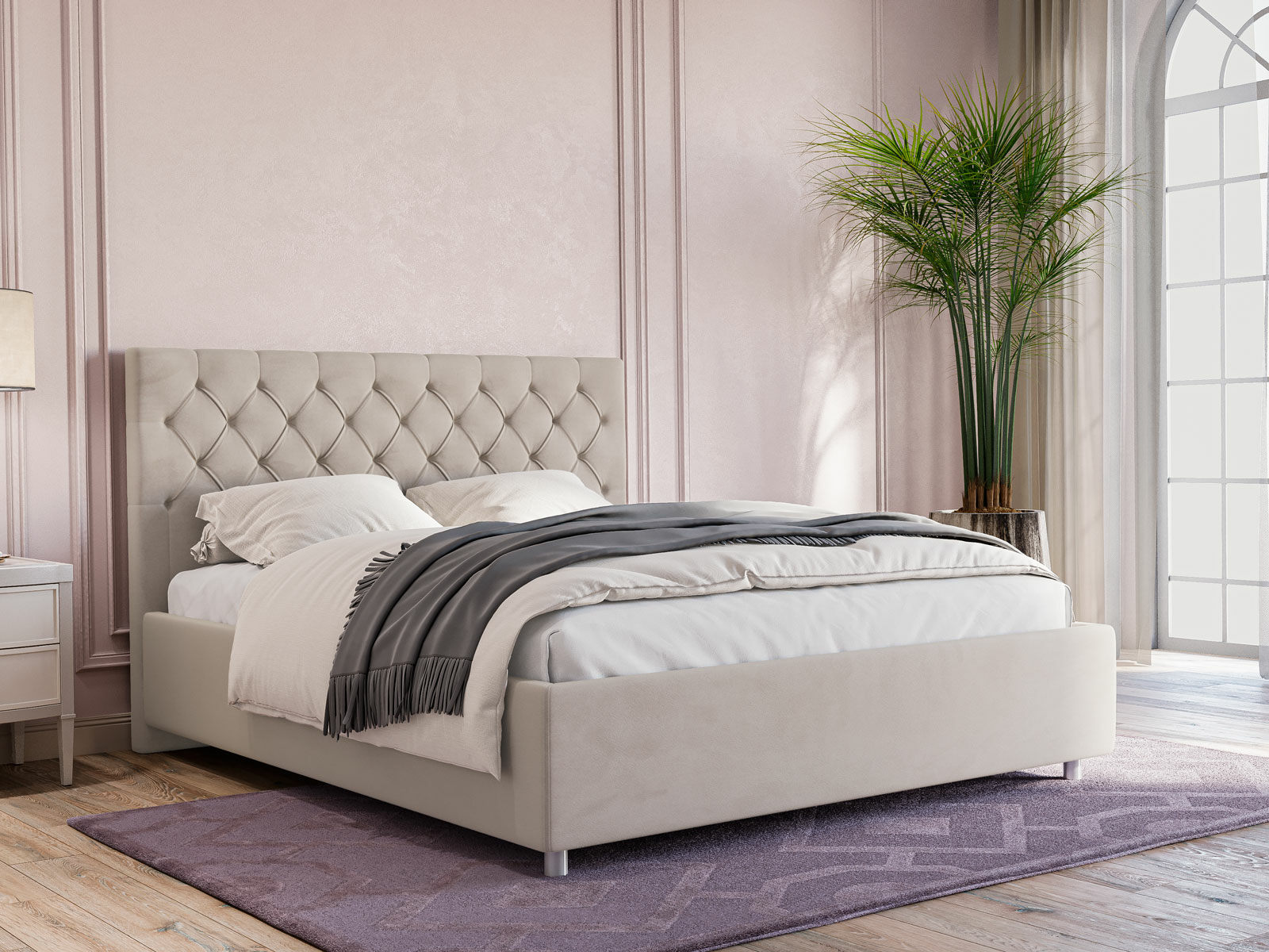 Продуманный дизайн спинки украсит минималистичный и классический интерьер. Классическая каретная стяжка на изголовье привлекает внимание и делает её невероятно эстетичной и изысканной.