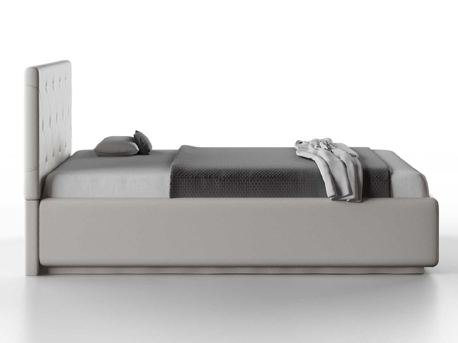 Кровать укомплектована IQ с подъемным механизмом и ящиком для белья без дна (дополнительная платная опция - дно к ящику IQ из HDF (ХДФ). Каркас кровати на цоколе, декоративный чехол на цоколе съёмный. Глубина ящика для белья - 30 см, без ограничения нагрузки на ящик.