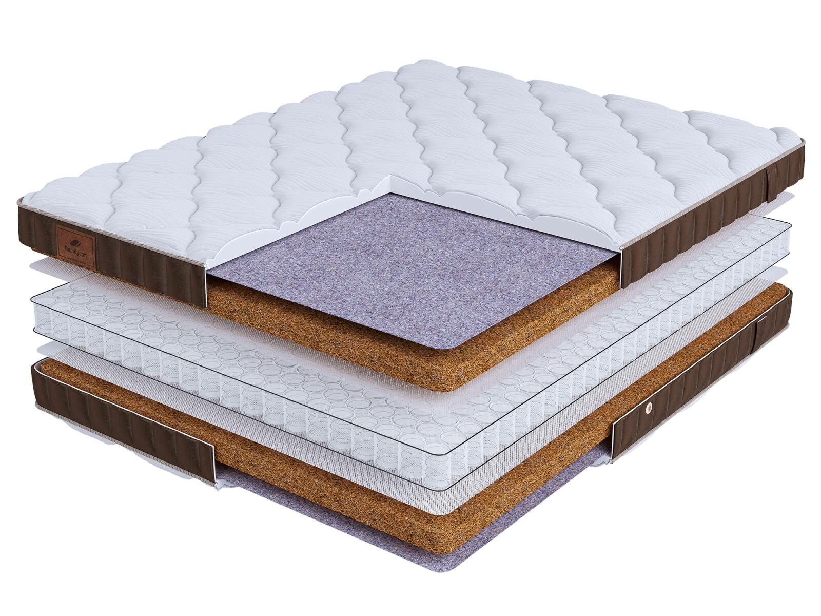 Хлопковая трикотажная ткань чехла обеспечивает комфорт и обладает отличной воздухопроницаемостью. Высокообъемная стежка с использованием холлофайбера (600гр.) подарит дополнительный комфорт спальному месту. Изысканный бурлет из мягкого велюра красивого бежевого цвета придает матрасу роскошный внешний вид и подчеркивает его премиальный статус. Каждая модель серии LIFE украшена фирменной кожаной биркой BeautySon, подтверждающая исключительность каждого матраса.