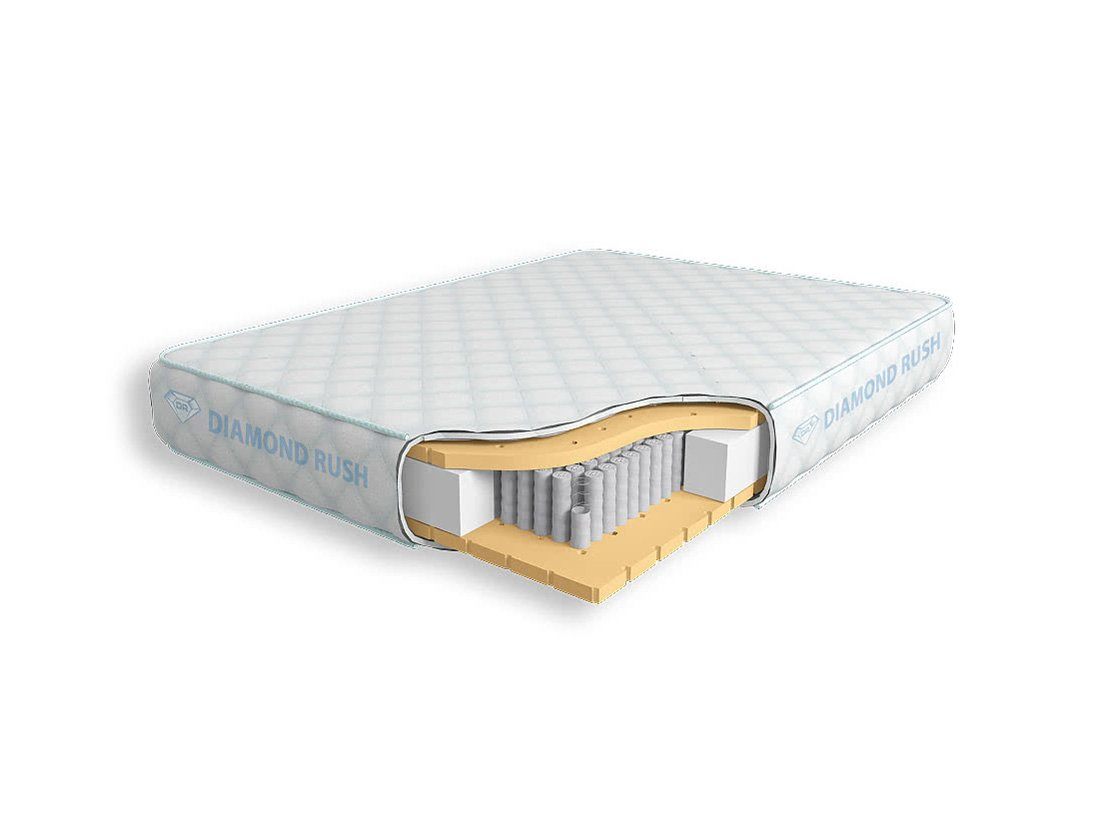 Матрас Diamond Rush Full Latex 1440DR имеет в своей основе независимый пружинный блок 1440, состоящий из пружин диаметром 3-4 см. В качестве настилочных слоев поверх пружинного блока используются листы перфорированного натурального латекса. Это один из самых мягких материалов, он позволяет максимально ощутить на себе ортопедический эффект от пружинного блока.