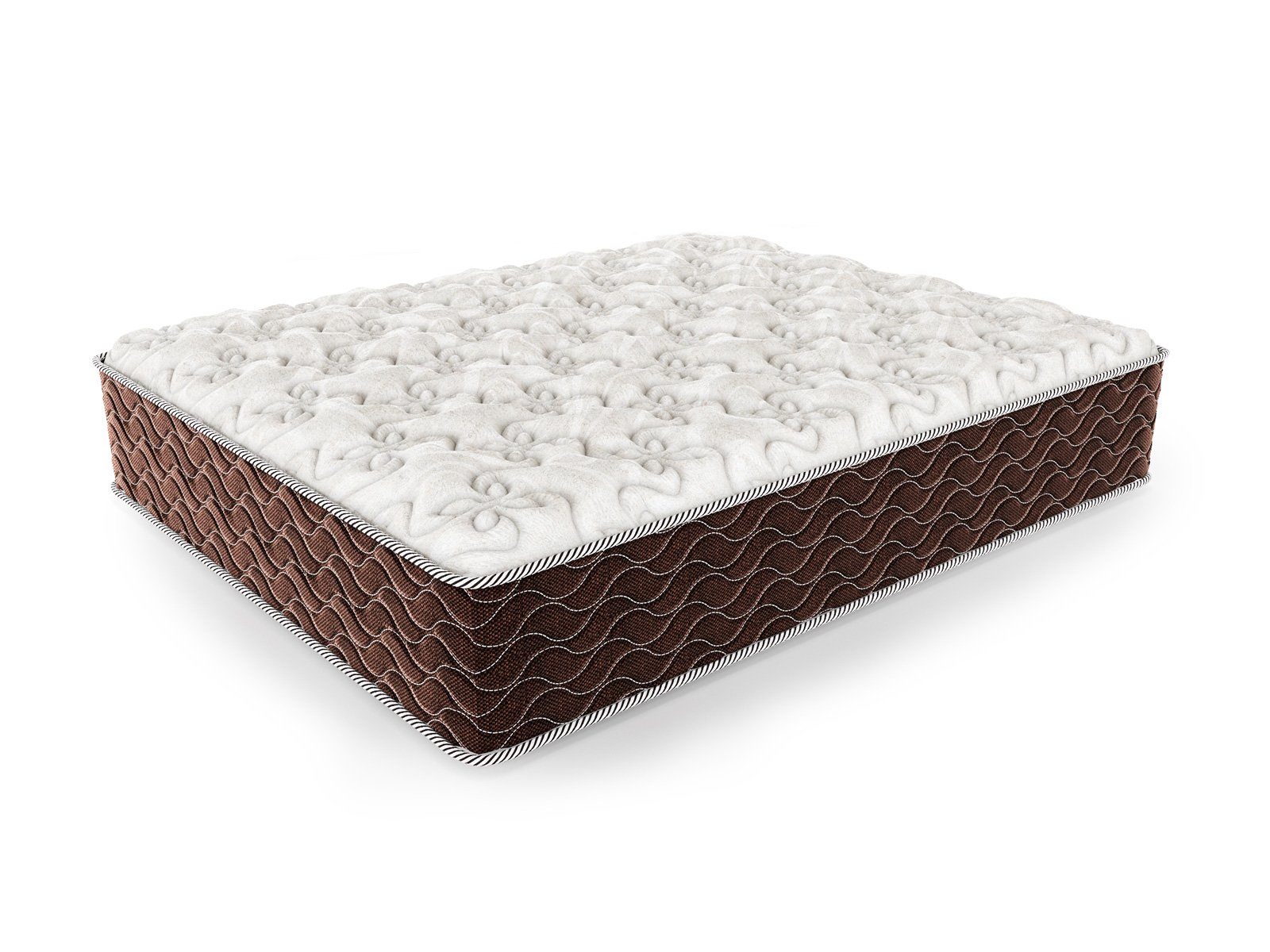 Чехол: несъёмный, из плотной трикотажной ткани с содержанием льна, простёган на искусственном волокне Холлкон (200 гр) и 0,8 см пены - пышность и объём. Бурлет матраса выполнен из плотного мебельного жаккарда шоколадного цвета, простёганного на ППУ 1 см — усиление периметра, сохранение геометрии матраса на протяжении всего срока службы.