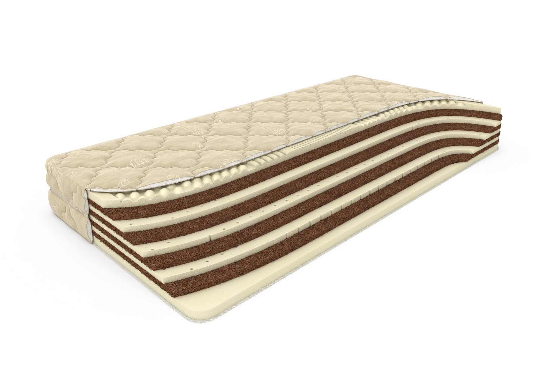 Основа беспружинного матраса Mix Massage состоит из попеременно уложенных четырех слоев кокосовой койры и трех слоев натурального латекса. Такое чередование материалов придает модели пружинистость и среднюю жесткость. С обеих сторон в качестве внешнего слоя используется семизональный латекс, эластичный и мягкий материал с разными зонами упругости и рельефной поверхностью. Именно он обеспечивает матрасу Mix Massage массажный эффект и комфортность. Общая высота данной модели составляет 19-20 см, а максимальная нагрузка на одно спальное место - 120 кг. Матрас оснащен съемным велюровым чехлом с пропиткой "антистресс".