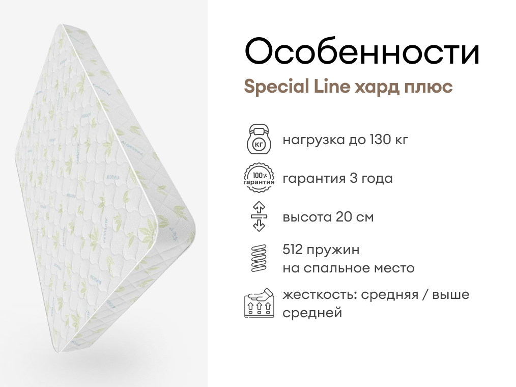 Матрас Мистер Слип Special Line хард плюс — это практичная модель для тех, кто ценит комфорт и возможность настроить спальное место под свои предпочтения. Благодаря разным уровням жёсткости сторон, он подойдёт для круглогодичного использования и различных потребностей.